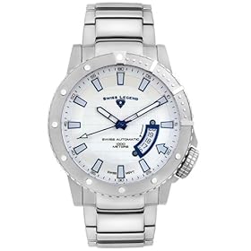 Featuring an undirectional bezel and water resistance to a depth of 3,300 feet, this Swiss Legend men's watch is an essential tool for divers. Solid stainless steel forms the 50-millimeter case, which is powered by automatic movement. Luminous indexes mark all hours -- an important feature for divers swimming in dark waters. A safety fold-over clasp with a push button keeps the sporty, stainless-steel band secure and an oversized date display at the four o'clock provides convenience. For a long-lasting performance, a sapphire dial window protects the white dial from accidental scratches.