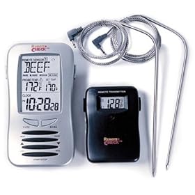 Meanwhile, hook the pager (two AA batteries included) to your belt or drop it into your pocket. The pager beeps when the monitor's alarm sounds and works up to 75 feet away, liberating the cook from the kitchen. The probes can also be plugged into the pager, which displays a food's temperature on its LCD screen. So barbecuing brisket outside, roasting chicken in the oven, and keeping track of both is possible. --Fred Brack