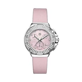 This TAG Heuer Formula One women's chronograph watch (model CAC1311.FC6220) blends a sporty attitude with a chic style that's made for walking the red carpet. The large 37mm (1.46-inch) stainless steel watch case is topped by a wide bezel that's illuminated by three rows of tiny, glittering white diamonds. It frames a delicious pink mother-of-pearl dial face, that's complemented by three chrono subdials, a mix of silver stick hour markers and Arabic numerals at the quarter hours, luminous dagger-style hands (with seconds hand), small minute indexes, and a date window between 4 and 5 o'clock. It's matched to a satin leather strap in pink. Other features include a precise Swiss quartz movement, highly scratch-resistant sapphire crystal, and water resistance to 200 meters (660 feet)--suitable for recreational scuba diving.