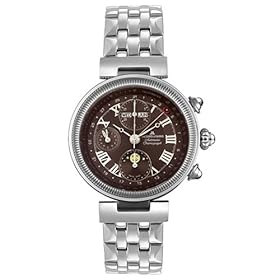 This exquisitely detailed automatic watch from Jacques Lemans captures the elegance of an earlier era. The large round steel case frames a textured brown dial with silvertone Breguet-style hands, a sweep seconds hand, applied Roman numerals, and a day/month/date display. Three round tonal subdials showcase a 30-minute timer, a moonphase indicator, and a 24-hour time display. A sapphire crystal caps the dial, and a skeleton caseback allows a view of the 25 jewel Swiss chronograph automatic movement. Vintage details, like a fluted bezel and antique style crown and pushers, add a note of distinction. This Jacques Lemans timepiece is showcased on a handsome and durable steel link bracelet and rated water resistant to 30 meters.