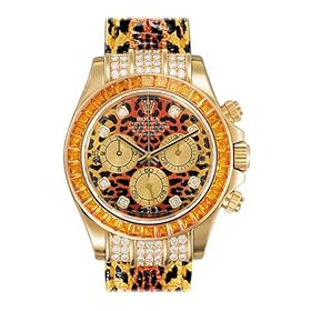Rolex Oyster Perpetual Cosmograph Daytona Leopard Watch. 40mm 18K yellow gold case, end pieces set with 48 diamonds, bezel set with 36 baguette cognac sapphires, screw-down push buttons, leopard dial, 8 diamond hour markers, and leopard strap with 18K yellow gold deployable fliplock clasp.