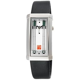 Add a uniquely designed conversation piece to your watch collection with this Willits timepiece from Bulova's Frank Lloyd Wright collection. It's based on an art glass design from the prairie-style Willits home in Highland Park, Illinois, constructed in 1901. This distinctively tall rectangular watch case emulates a stained glass window from the front of the residence, and it features a white enamel dial with art deco flourishes. The stainless steel case offers a polished finish and an off-center crown. It's matched with a smoothly supple black leather strap. This precise quartz timepiece also features a scratch-resistant mineral crystal and water resistance to 30 meters (99 feet).