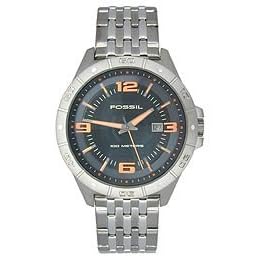 A classic design with a sporty edge. This Fossil watch features a stainless steel and smoke ion-plated bracelet and case. Black dial with logo, date window, orange numerals at 12, 3, 6 and 9 o'clock and orange stick indexes. Three hands. Quartz movement. Water resistant to 100 meters. Eleven-year limited warranty. Comes packaged in a collectible tin.