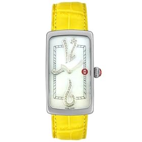 Dress like you know you're worth it with the Michele Women's Attitute Diamond Watch on your arm. This divine timepiece is constructed with a stainless steel case, a rectangular stainless steel bezel, and a vibrant yellow alligator-leather wristband that is secured with an adjustable buckle clasp. A scratch-resistant sapphire window shields the white mother-of-pearl dial, which features diamond-studded Arabic numeral hour markers at six and 12 o'clock, as well as the MW logo at three o'clock and a diamond hour index at nine o'clock. The refined face also includes black minute indexes and silver-tone watch hands. Powered by precise Swiss-quartz movement, this watch is water resistant to 99 feet (30M).